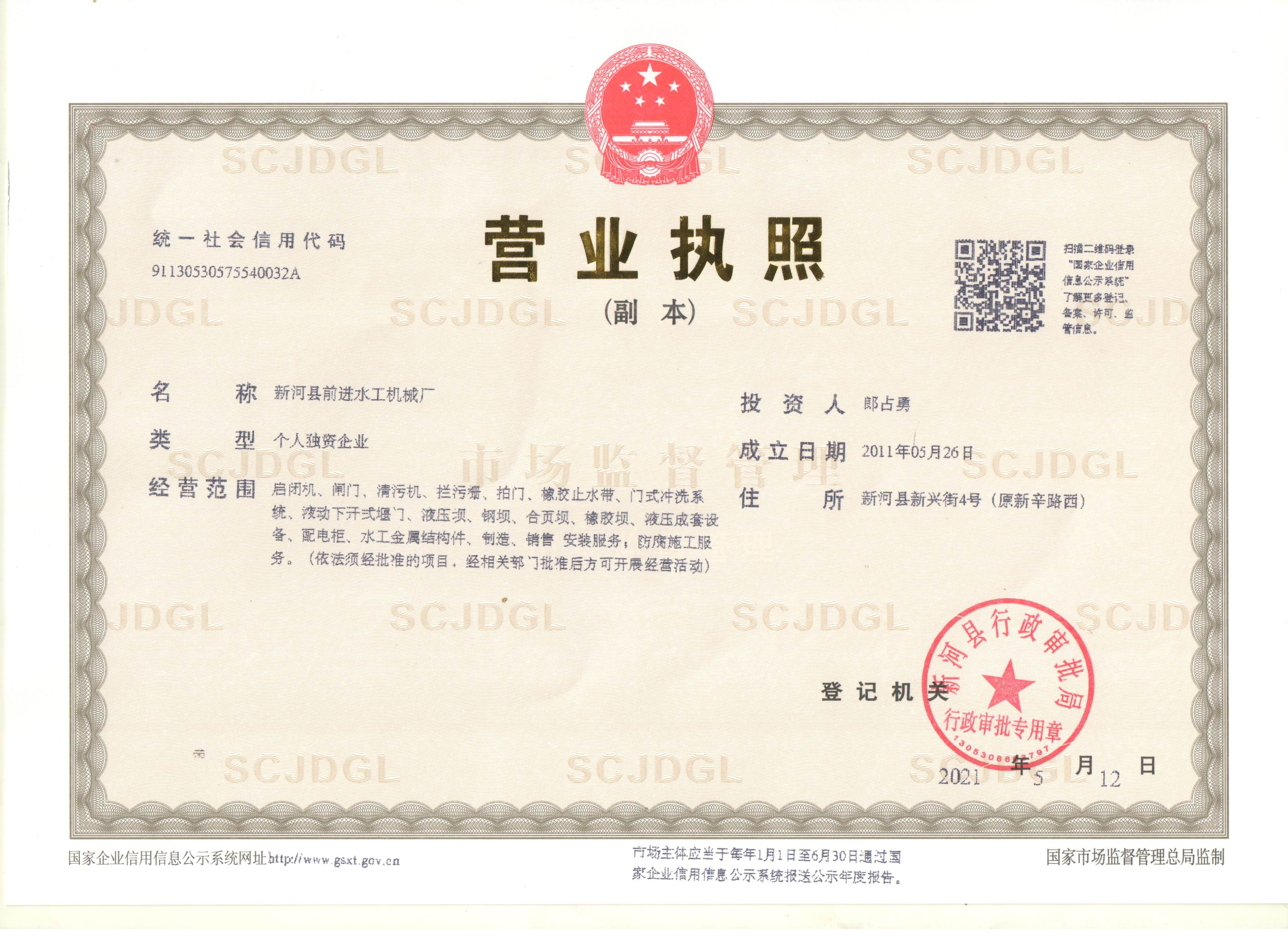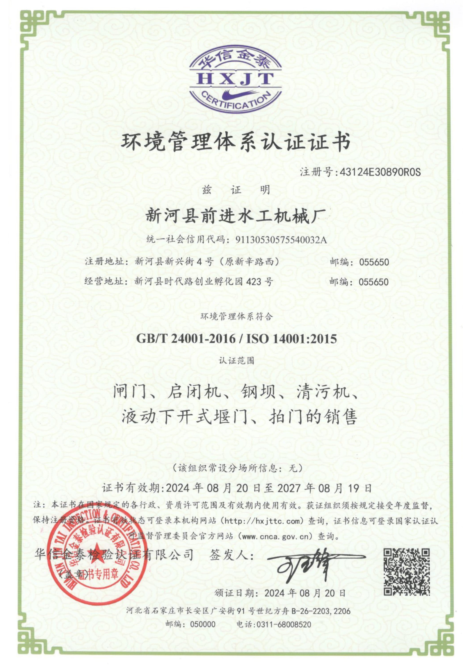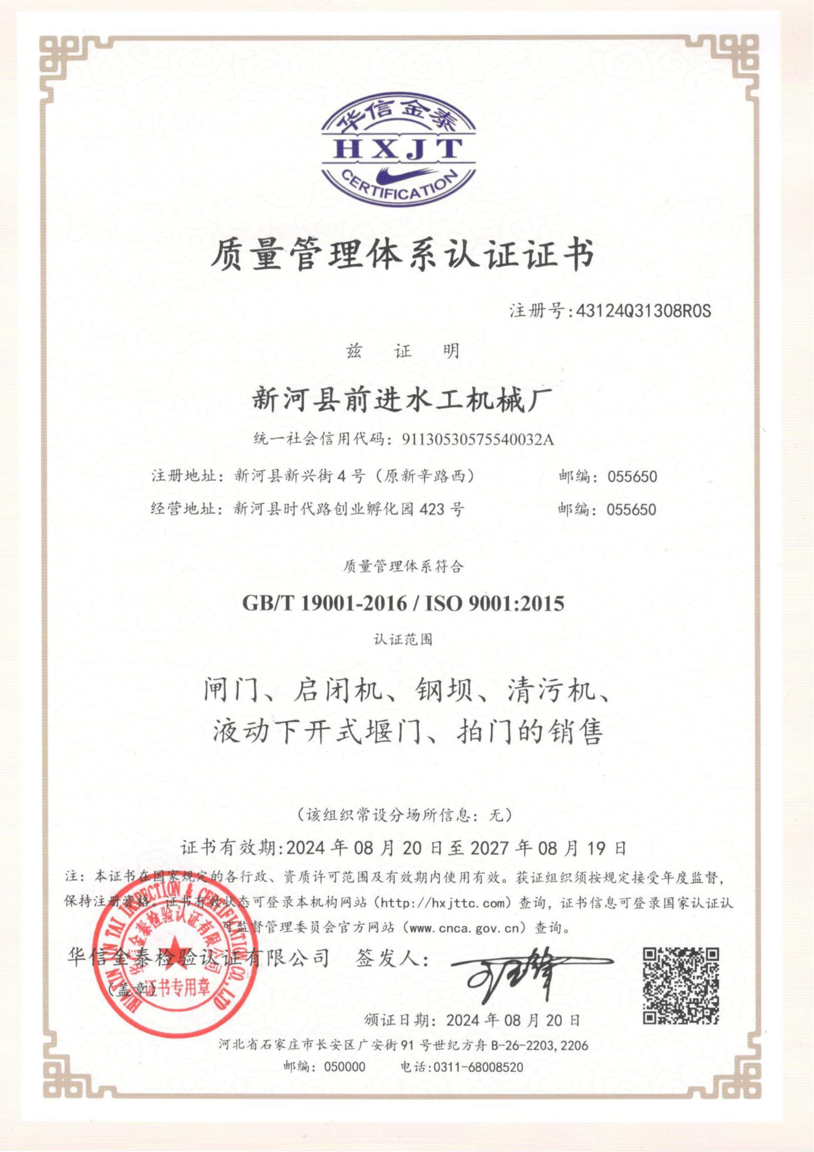 新河縣前進水工機械廠是一家專門從事水利工程設備研發(fā)生產的廠家,現有員工228人,各類高、中級專業工程技術人員近30人,技術生產工人180多人。公司占地面積14674平方米。公司擁有車、鉗、刨、銑、冷作、鈑金、鑄造等,工種齊全,加工能力和技術力量雄厚,并具備理化測試手段與儀器設備。前進水工專注景觀閘門,鋼壩,合頁壩,液壓升降壩,液壓閘門,臥倒門,一字門,人字門,液壓啟閉機,卷揚啟閉機,螺桿啟閉機,清污機,除污機,閘門,拍門等設備的研發(fā)與生產,是新河水利工程產品行業的領跑者,不僅在同行業群中揭起了一次又一次的技術革新,更為水利工程企業提供了更高更大的選擇平臺。